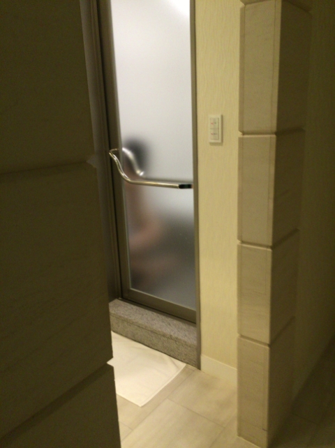 扉のすりガラス越しに映る彼女の姿とテレビで流していたアダルトチャンネルの両方を観ながら、チンコに元気をどんどん注入して!我慢汁が出るまで膨張させた俺だったぞぉ(笑)。